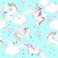 Unicorns op wolkjes en regenboogjes in vrolijke kleuren voor een kinderkamer gemaakt in aquarel.