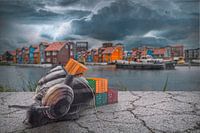 Deze prachtige beeldmanipulatie toont twee slakken die aan het werk zijn in een haven, tegen de achtergrond van een grauwe lucht. Ondanks het sombere weer, straalt de afbeelding vrolijkheid en kleur uit, waardoor het een boeiende en levendige toevoeging is aan elk interieur. De combinatie van de surrealistische elementen en de levendige kleuren zorgt voor een speelse en inspirerende sfeer, perfect om een ruimte op te fleuren.