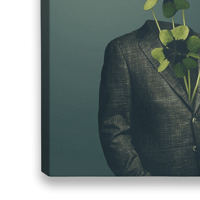 Unieke Fotomanipulatie: Man in Pak met Klavertjesvier Hoofd - Creatieve Kunst voor Wanddecoratie van Elianne van Turennout