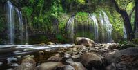 Een prachtige sprookjesachtige waterval dat stroomt uit het bos in de rivier. Het is alsof het bos weent en de tranen worden opgevangen door de snelstromende rivier.