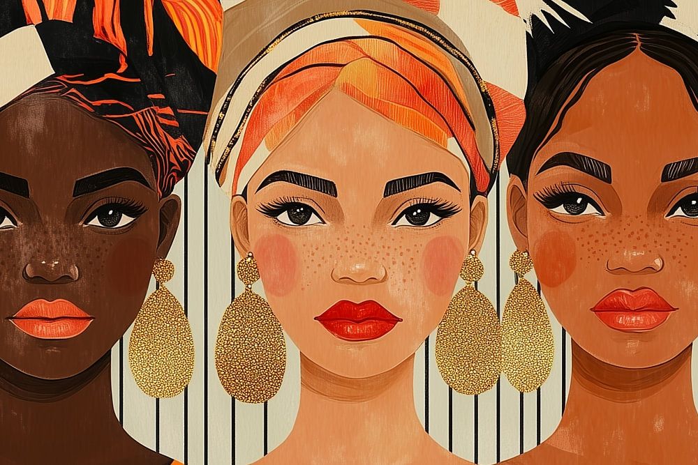 De hoofddoeken en shirts van de vrouwen bevatten Afrikaanse invloeden in hun patronen, wat een gevoel van rijkdom en geschiedenis toevoegt aan het werk. Deze patronen, gecombineerd met de aardse kleuren, brengen een gevoel van trots en eerbetoon aan de wortels van elke vrouw. De gouden oorbellen zijn een subtiele verwijzing naar de kracht en het vrouwelijke in al zijn vormen.