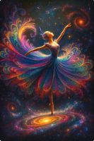 Een ballerina in een verbluffend kleurrijke en abstracte voorstelling van een dans te midden van een kosmische achtergrond. De ballerina is afgebeeld in een elegante pose, met haar armen wijd gespreid en lijkt te zweven of te dansen in de ruimte. Haar jurk is een explosie van levendige kleuren die lijken te stralen en uit te waaieren, vergelijkbaar met een galactische nevel of een regenboog. Rondom haar zijn spiraalvormige patronen en sterrenstelsels te zien. Het maakt het geheel magisch en etherisch.