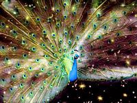 Digitaal bewerkte foto van een pauw met het Universum vol sterren op de achtergrond