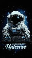Een DJ-astronaut draait nummers op decks tegen een zwarte sterrenhemel. De tekst luidt: "MUSIC IS MY UNIVERSE," met de ultieme kosmische soundtrack vibe.