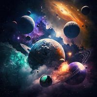 Haal de schoonheid en het mysterie van de kosmos in huis met dit adembenemende digitale kunstwerk. Dit kunstwerk toont een kleurrijke galaxy met allemaal planeten en sterren die op een unieke en artistieke manier zijn vormgegeven. Laat je verbeelding de vrije loop terwijl je jezelf verliest in de diepten van de kosmos. Elk detail van dit kunstwerk is met zorg gemaakt en zal een geweldige toevoeging zijn aan elke kamer. Bestel nu dit prachtige kunstwerk en ervaar de magie van de ruimte in je eigen huis.