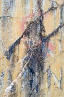 Abstract. Schimmig figuur op een muur van een grindopslag bij een betoncentrale. De muur is ruw van oppervlak, maar heeft subtiele pasteltinten...