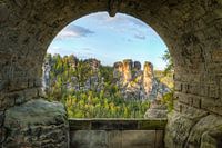 Blick durch einen der Brückenbögen der Basteibrücke in Richtung Felsformation "Kleine Gans", die von den Sonnenstrahlen am späten Nachmittag erleuchtet wird.