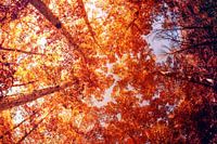 Kijk omhoog,door de bomen met hun herfstbladeren en mooie goudgele herfst kleuren naar de blauwe lucht