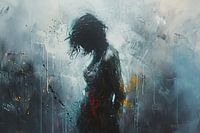 Urban Abstract Art | Contrast van Rust - Met sterke, dynamische penseelstreken brengt dit schilderij een silhouet van een persoon tot leven tegen een achtergrond van wervelende grijstinten die de stedelijke chaos oproepen. De felle accenten van oranje, roze en geel voegen een expressieve, maar subtiele energie toe die de rauwe emotie van de stad verbeeldt. De ruige textuur en de gecontroleerde toevalligheid van dit werk resoneren met de ongetemde geest van de urban street art.