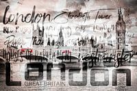 Een typisch uitzicht vanuit Londen. Twee rode bussen steken Westminster Bridge over. De Houses of Parliament staat op de achtergrond. Modern werk met ingebedde typografische elementen en een decoratief patroon. Een unieke wanddecoratie!