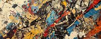 Urban Artwork - Dit dynamische stuk speelt met textuur en contrast door een explosie van zwarte spetters, die een gevoel van beweging geven te midden van een pallet vol blauwe en rode accenten. Het is een ware visuele symfonie van urban street art, waar de spontaniteit van de druppels en lijnen een verhaal van stedelijke energie schildert.