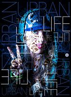 Digitaal kunstwerk 'Urban Life Blue' gemaakt van een portretfoto van een stadsmeisje in combinatie met de tekst urban life. Gemaakt in vier kleuren.