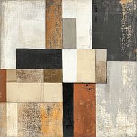 Urban Canvas - Dit abstracte schilderij kenmerkt zich door een speelse compositie van geometrische vormen in een gevarieerd palet van aardetinten en metallics, wat een gevoel van balans en harmonie uitstraalt.