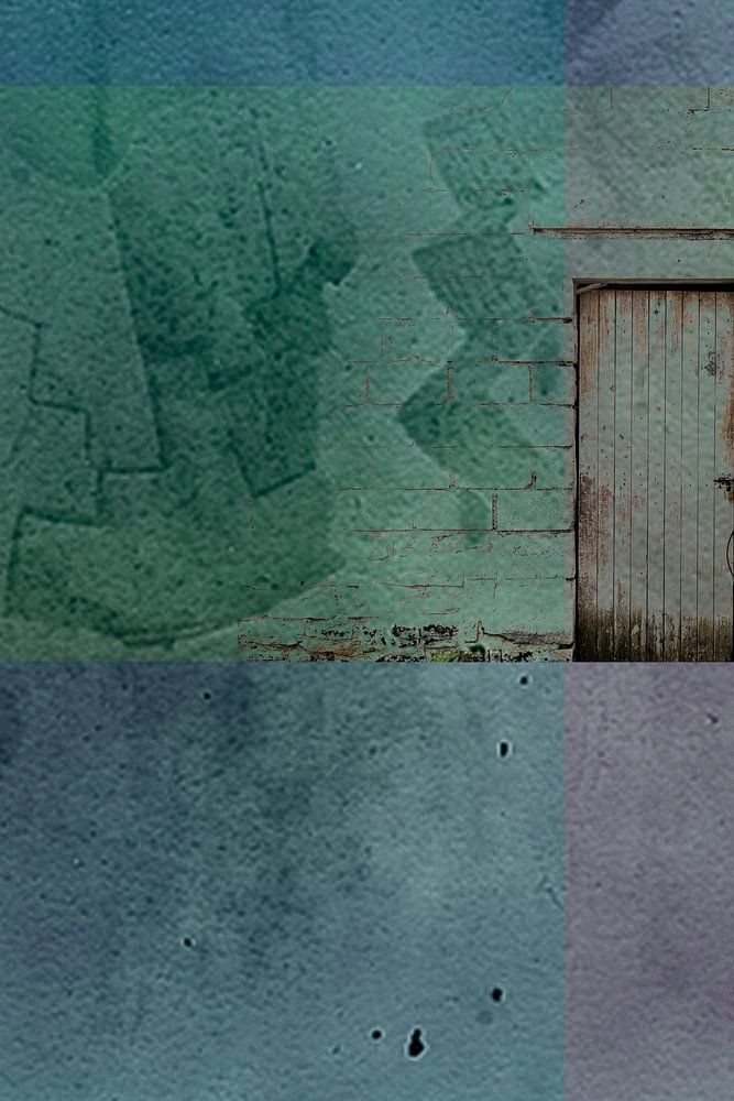 De bovenste sectie toont een abstracte mix van blauw- en groentinten, met subtiele penseelstreken die doen denken aan een aquarel of verweerde muur. Daaronder bevindt zich een gedetailleerd fragment van een bakstenen muur met een houten deur, die een gevoel van geschiedenis en authenticiteit toevoegt. Het onderste deel van het beeld wordt gedomineerd door de roestbruine, metalen structuur van een brug met opvallende spanten die een modern, industrieel accent geven.