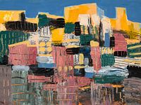 Het schilderij 'Urban Composition’ laat de stad zien in vlakken en lijnen tegen de achtergrond van een strakblauwe lucht. De skyline in diepe groen- en taupetinten, met accenten van geel en rozerood, roept een gevoel op van kalmte te midden van stedelijke structuren. Een schilderij dat de ruimte geeft aan stilte in het ritme van de stad.