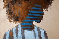 Urban Contour - Dit mannen schilderij toont een zijprofiel van een persoon met een visueel opvallend, gestreept blauw patroon over zijn gezicht, geaccentueerd door roestbruine en diepbruine textuur die een ruw, industrieel gevoel geven tegen een neutrale achtergrond.
