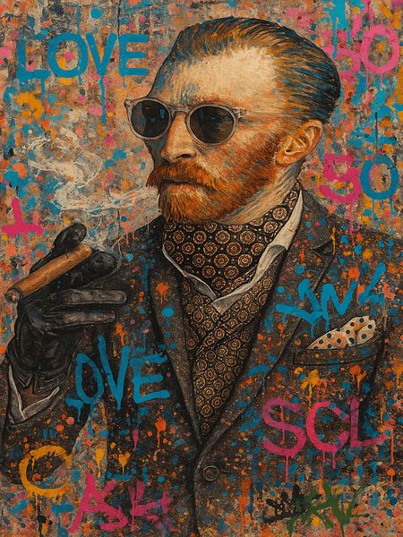 Mixed media-portret van een roodharige dandy met ronde zonnebril, handschoenen en sigaar. Een strak pak met gedessineerde stof ontmoet een levendig gespoten graffiti-achtergrond met "LOVE"-tags, kleurdruppels en neonaccenten in turquoise, magenta en oranje. De mash-up van klassieke geschilderde look en street art geeft het motief een…