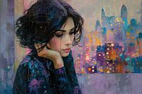 Urban Dreamscapes - Dit vrouwen schilderij toont een zichtbaar introspectieve jonge vrouw met een dromerige blik, kijkend naar beneden, met een semi-abstracte stadsachtergrond die een levendige en lichtgevende impressie geeft van een stedelijke nacht. De vrouw, dominant in de voorgrond, draagt een textuurrijke, donkere blouse versierd…