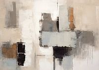 Urban Elegance - Dit abstracte schilderij bevat een samenspel van blokkige structuren en vlakken met een dominante beige achtergrond, verrijkt met details in zwart en grijstinten die diepte en contrast toevoegen.