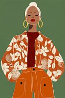 Een stijlvolle illustratie in warme herfsttinten die moderne mode en botanische elementen combineert. Het beeld toont een eigentijdse compositie met een floral bedrukte jas in terracotta tinten, gecombineerd met een dieprode top en oranje broek. De minimalistische stijl met een retro twist wordt versterkt door de groene achtergrond en gouden oorbellen, wat resulteert in een tijdloos modepotret.