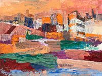 Het schilderij ‘Urban Landscape’ is opgebouwd met brede paletmesstreken waarin lagen van oranje, rood, groen en blauw elkaar afwisselen. Het stedelijk silhouet wordt fragmentarisch gesuggereerd en gaat op in abstracte kleurvlakken. Door de techniek ontstaat een gelaagd beeld waarin architectuur en landschap visueel…