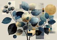 Urban Nature's Calm Vibes - Dit botanische schilderij toont een tak met bladeren en bessen in verschillende blauwtinten, gecombineerd met abstracte vormen in goud en grijs, wat een moderne indruk maakt in een minimalistische stijl.
