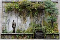 Een man, gevangen in stilte, staat voor een verweerde muur waar natuur en stad langzaam met elkaar versmelten. Het kunstwerk ademt melancholie en tijdloosheid, een poëtisch tafereel dat de kracht van vergankelijkheid en reflectie vangt.