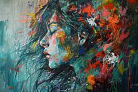 Urban Portret Art - Dit schilderij toont een expressief portret van een vrouw omgeven door een levendige explosie van kleuren die haast van het doek afspatten. Het is een perfecte harmonie tussen figuratieve en abstracte elementen, waar de emotionele uitdrukking van het onderwerp in balans is met de dynamische achtergrond. De koele turquoise ondertoon verzacht de heldere oranje, rode en gele accenten die de aandacht opeisen.
