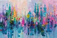 Urban Pulse - Dit abstracte schilderij toont een levendige, kleurrijke stadsgezicht, gedomineerd door speelse druppels en vlekken in een reeks van heldere kleuren die de dynamiek en energie van een bruisende metropool suggereren.