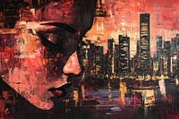 Urban Serenity - Dit stadsgezicht schilderij vermengt de contouren van een rustig gesloten vrouwenprofiel met de bruisende skyline van een moderne stad, uitgevoerd in een dynamisch palet van voornamelijk rood- en bruintinten.