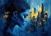 Urban Silhouette - Dit moderne stadslandschap schilderij belicht een vrouwelijk profiel tegen een achtergrond van abstracte, hoogbouw stedelijke silhouetten in krachtige blauwe en gele kleuren.