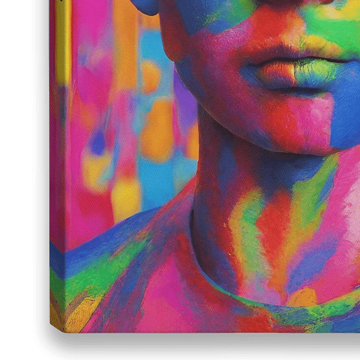 Dit kunstwerk toont een gezicht in levendige kleuren, waarbij elke kleur lijkt te dansen op het gezicht van de persoon. De felle tinten zijn in een abstract patroon aangebracht, wat resulteert in een dynamisch en expressief portret. De achtergrond bestaat uit vergelijkbare kleuren en patronen, wat een gevoel van continuïteit en eenheid…