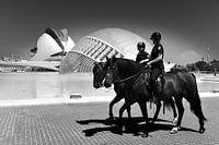 Moderne architectuur, ruiters in modern straatbeeld, straatfoto, straatfotografie, architectuurfoto, architectuurfotografie, hoog contrast, zwart-wit foto, zwart-wit fotografie, horizontaal beeld, urban, spanje, valencia, Rob Blok Photo