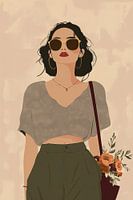 Een stijlvolle illustratie van een moderne, zelfverzekerde vrouw in een casual chique outfit. De grijze crop top en olijfgroene broek vormen een perfecte basis voor de accessoires: een trendy zonnebril, gouden hoops en een delicate ketting. De burgundy schoudertas met romantische bloemen voegt een verfijnde touch toe aan deze urban…