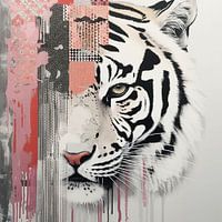 Tijger in zwart-wit, gecombineerd met abstracte elementen en een urban art-invloed, zoals zichtbaar in de druipende verf en collage-achtige patronen.