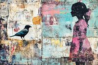 Urban Vogel - Dit is een urban kunst schilderij met een silhouet van een jong meisje aan de rechterkant, kijkend naar een zwarte vogel aan de linkerkant, tegen een achtergrond van kleurrijke, verweerde abstracte texturen.