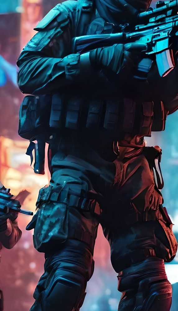 Dit indrukwekkende digitaal kunstwerk toont een scene van intense actie en spanning, waarin gewapende elitesoldaten door een met lichtreclames verlichte straat trekken. Het beeldt een stad in conflict af, waar de grens tussen orde en chaos vaag is en de helden van de natie worden opgeroepen om hun plicht te vervullen.