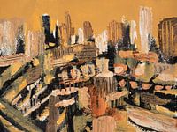 Het schilderij ‘Urban Warm Sky’ is een abstracte stadsimpressie in warme kleuren en dynamische zwarte lijnen. De stad is in beweging, met een opvallende okergele lucht die het geheel extra diepte en een warme sfeer geeft.