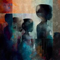 4 kinderen op een rij, de grootste voorop, met daarachter zijn broertje, zusjes, vriendjes of vriendinnetjes. 4 kindjes in abstracte silhouetten. De onderzijde en de silhouetten in het portret zijn donker, bijna zwart. Terwijl bovenin de kleuren aards zijn en warm, met kleuren als rood, terracotta en oker geel. Daarnaast zijn er blauwe, groene en paarse kleuren te ontdekken in dit schilderij.