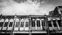 Zwart wit panorama foto van urban luiken en deuren in een Straat van Maleisie, George Town, Penang street art. Sterke contrasten. Straatfotografie