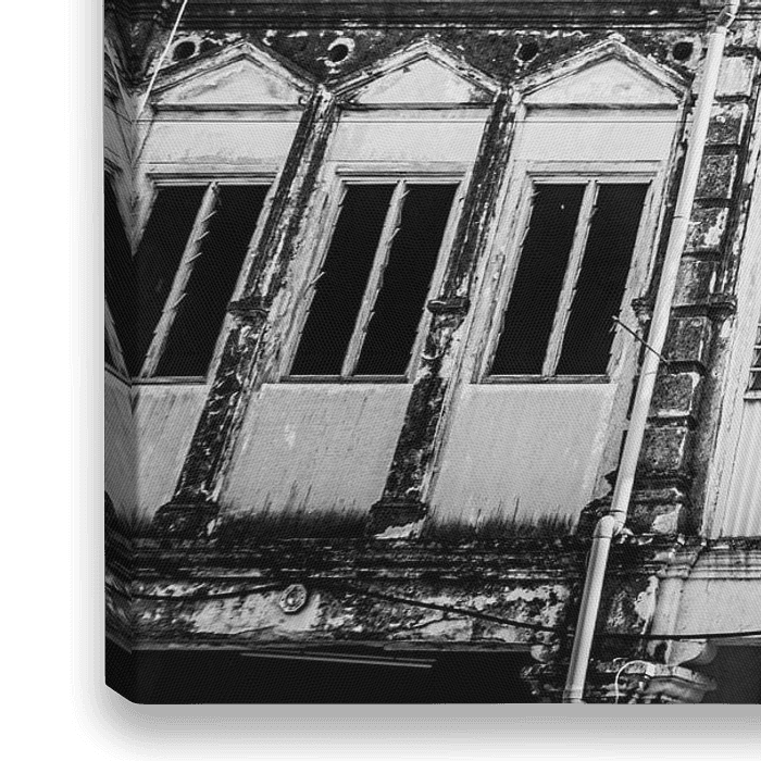 Zwart wit panorama foto van urban luiken en deuren in een Straat van Maleisie, George Town, Penang street art. Sterke contrasten. Straatfotografie