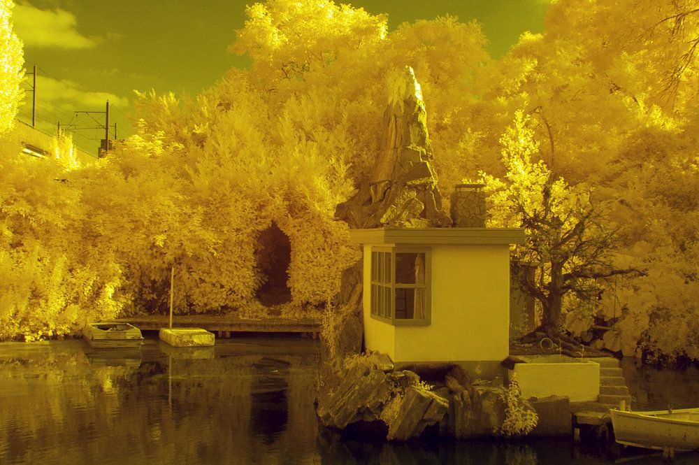 Deze "false color" infrarood foto van de schooltuinen in Amsterdam is gemaakt met een 680nm filter