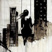 Gevoel van vrijheid. Schommelend hoog in de lucht tussen de gebouwen. Gewichtloosheid, vrij van gedachten, een met de lucht. Zwartwit, sepia en beige. Lijnen. Overstijgend. Passend bij diverse stijlen en trends.