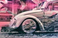 Een fraai gevormde oude auto gecombineerd met vrolijke kleuren afkomstig van een oude muur.