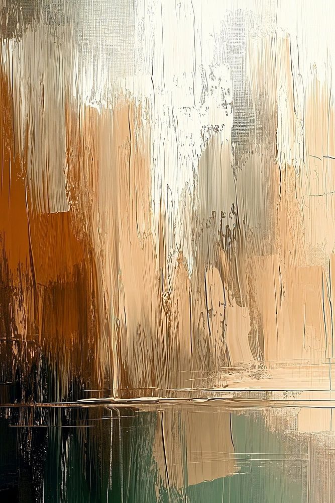 Dit abstracte schilderij versmelt stedelijke en natuurlijke elementen. Verticale streken suggereren een skyline of bos, terwijl horizontale lijnen een wateroppervlak oproepen. Warme oranje en koele groene tinten contrasteren, verenigd door neutrale tonen. Het werk straalt contemplatie en mysterie uit, vervagend de grens tussen realiteit en abstractie. De dynamische compositie nodigt uit tot persoonlijke interpretatie. Het weerspiegelt de complexe balans tussen natuur en kunstmatige omgeving, en roept innerlijke rust en verwondering op.