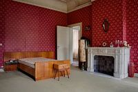 Een slaapkamer met dit aparte behang en een open haard in een verlaten villa.