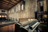 Een kerkorgel met oude muziek bladen in een verlaten en vervallen kerk in België.