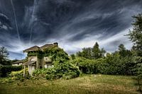 Een huisje compleet bedolven onder varens, klimop en andere planten.