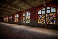 Urbex: Glas in lood ramen in een van de vele gebouwen van een verlaten kristalfabriek.