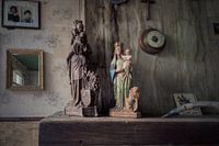 Religieuze beeldjes in een verlaten en vervallen slagers huis in België.